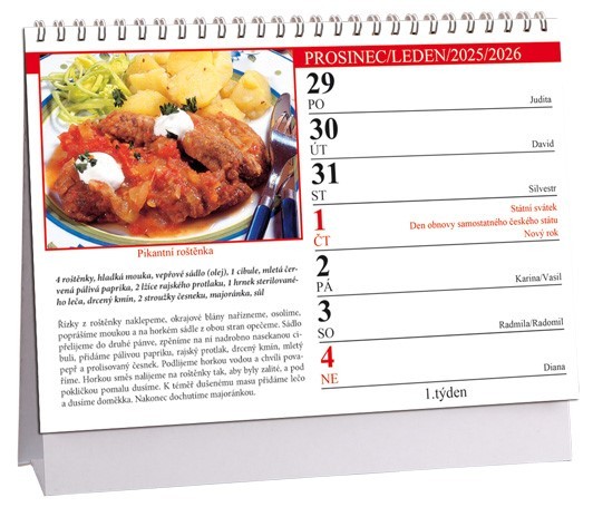 formát: 230 × 160 mm počet stran: 60 kalendárium: české týdenní kalendárium, fáze měsíceinformační stránky: seznam jmen, tabulkové kalendáře, plánovací kalendář na příští rok