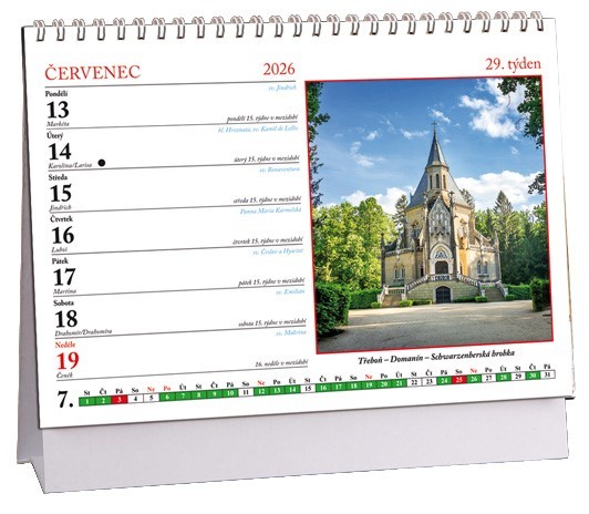 formát: 230 × 160 mm počet stran: 60 kalendárium: české týdenní kalendárium, fáze měsíceinformační stránky: seznam jmen, tabulkové kalendáře, plánovací kalendář na příští rok