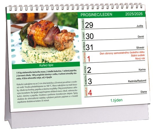 formát: 230 × 160 mm počet stran: 60 kalendárium: české týdenní kalendárium, fáze měsíceinformační stránky: seznam jmen, tabulkové kalendáře, plánovací kalendář na příští rok