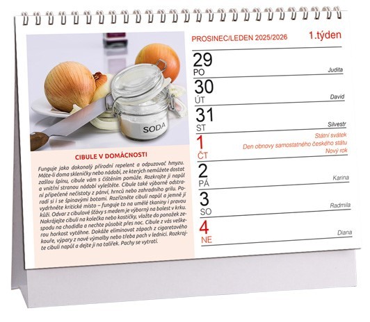 formát: 230 × 160 mm počet stran: 60 kalendárium: české týdenní kalendárium, fáze měsíceinformační stránky: seznam jmen, tabulkové kalendáře, plánovací kalendář na příští rok