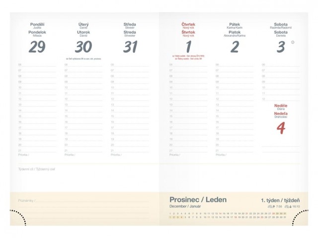 DIÁŘ OBSAHUJE:- roční přehled roku- plánovací kalendář- čtvrtletní plánovací kalendář- abecední seznam jmen- státní svátky- mezinárodní svátky- 7 stran pro poznámky- mapy- jmenné kalendárium- číslování týdnů- státní svátky a významné dny- východy a západy Slunce- fáze měsíce- letní a zimní čas- znamení- přehled dvou měsíců